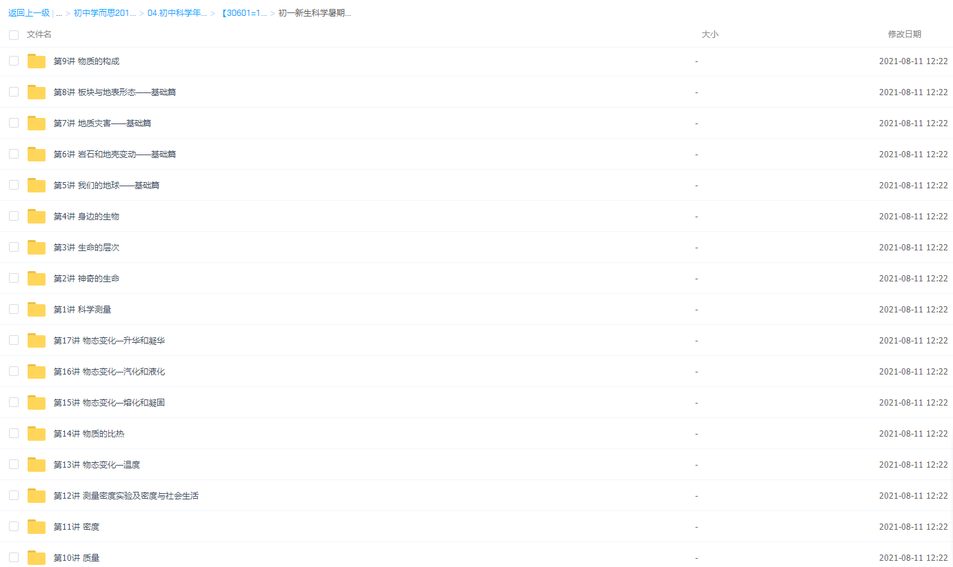 此课件来自学而思网校,初一新生科学暑期(浙教版预习领先班),包含视频课程和讲义资料 。此课件的主要知识点包括:科学测量、物质的构成、地质灾害、物质的比热、物态变化、测量密度实验及密度与社会生活、神奇的生命。