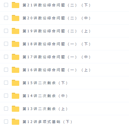 全国高中数学联赛竞赛遵循“课堂教学为主,课外活动为辅”的原则,此课件来自学而思网校,数学竞赛陈晨高二数学全国联赛班。此课件主要知识点包括:数论复习、同余复习、不定方程、多项式基础、二次剩余、数论综合问题等视频。