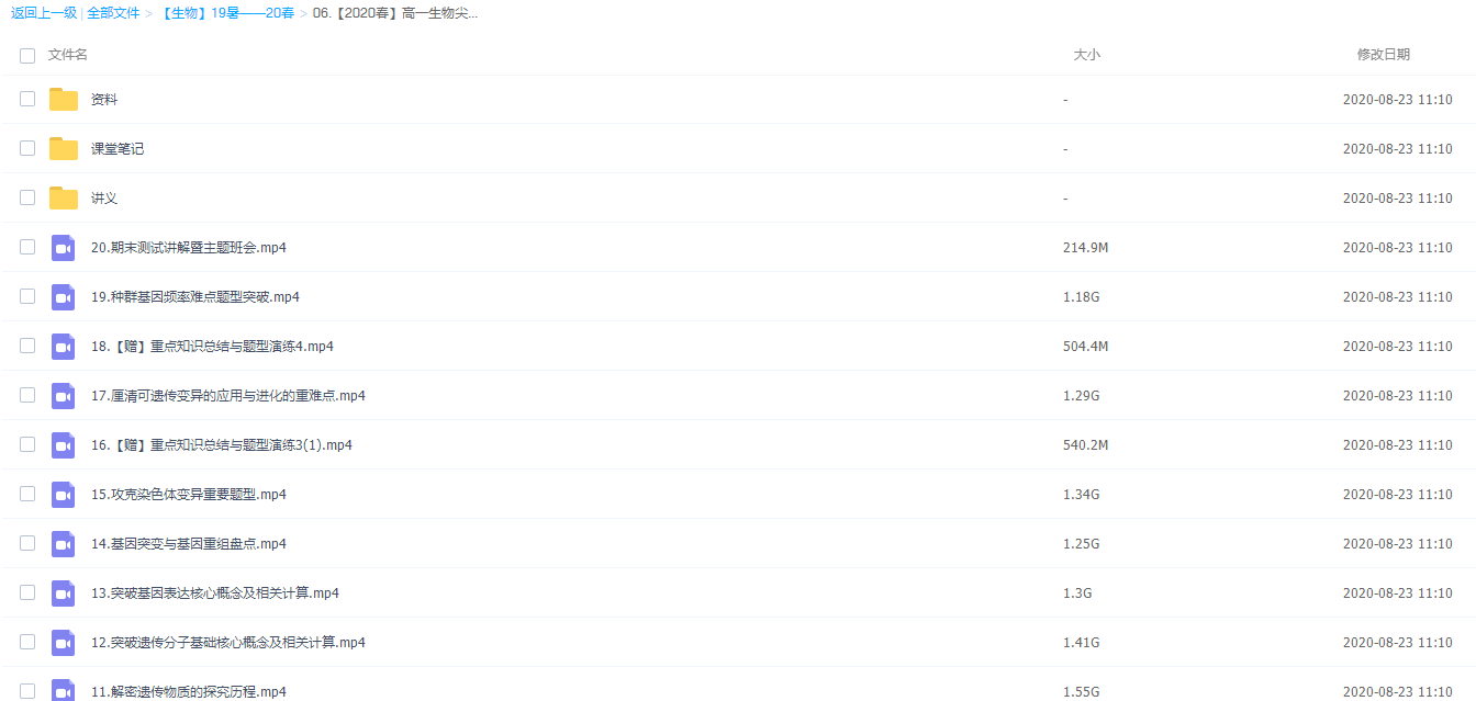 此课件来自作业帮网校,高一生物尖端班19-20学年直播课四季完整视频,包含视频课程和讲义资料 。主讲段瑞莹老师在课程中渗透培养学生“构建知识体系”的生物学习能力,教授学生合理“分类刷题”的做题练习方法,实现生物稳步提升。此课件主要包括:高一生物尖端班(19暑假班)、高一生物尖端班(19秋季班)、高一生物尖端班(20寒假班)、高一生物尖端班(20春季班)。