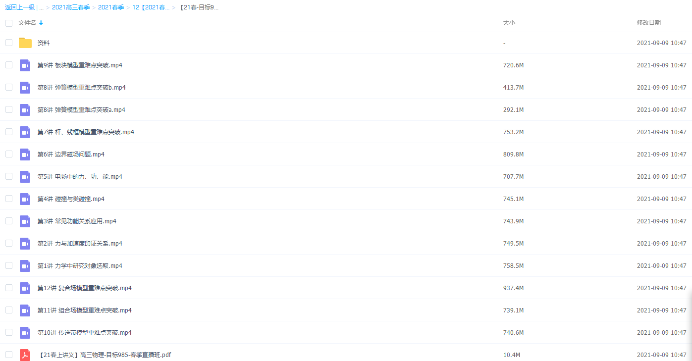 此课件来自于学而思网校,2021学而思高三章进物理春季二轮复习(下)目标985直播班视频课程,包括课程视频回放以及课堂资料讲义。此课件主要知识点包括:力与加速度印证关系、常见功能关系应用、碰撞与类碰撞、边界磁场问题、弹簧模型重难点突破、板块模型重难点突破、传送带模型重难点突破、组合场模型重难胜点突破和复合场模型重难点突破等视频。