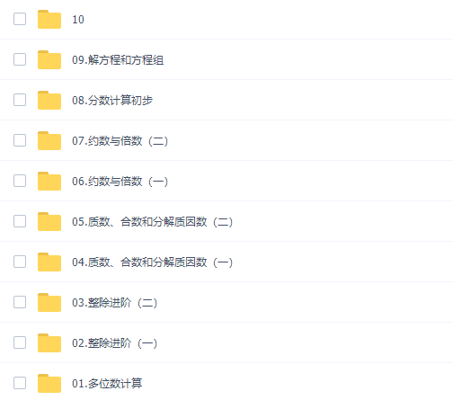 此课件来自小学数学蘑菇培优四年级数学课程2021年暑期卓越班,此课件主要知识点包括:多位数计算、整除进阶、质数、合数和分解质因数、约数与倍数、分数计算初步、解方程和方程组 。